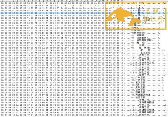 第二天:BIN文件用windows是打不开的,要用专用的软件。我下载的是UltraEdit.用这个软件打开BIN文件,你会发现许多数字和字符,其实这是汇编,也是一种语言。不用管它。当你把软件拉到这个位置的时侯你就会发现节目单了咋一看节目单对应的字符没有什么规律,但是我在这里告诉大家的是这里是16进制的,如转到10进制的你就会发现这正是我们要找的PID!!图片中蓝色部分就是CCTV1的数据,昨天我把它改成了CCTV2成功!!最前面的两组00 02代表频点。后面0834 0834转成10进制是视频PID.0835是音频PID,03E9是PTM,434354562D310000000000000000是台标,后面的03E9也是PTM,在后面的00 01 1F是节目号。它的格式是频点(两组数字)+视频PIN(四组)+音频PID(两组)+PTM(两组)+节目单(9组)+PTM(两组)+节目号(三组)。