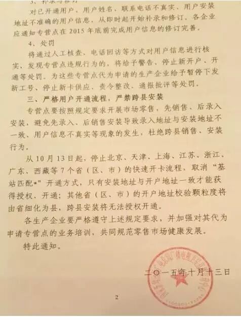 7.10月13号起,北京、天津、上海、浙江、江苏、广东、西藏7省市快速开卡,取消基站匹配*开通方式,只有安装地址与开户地址一致才能授权。
