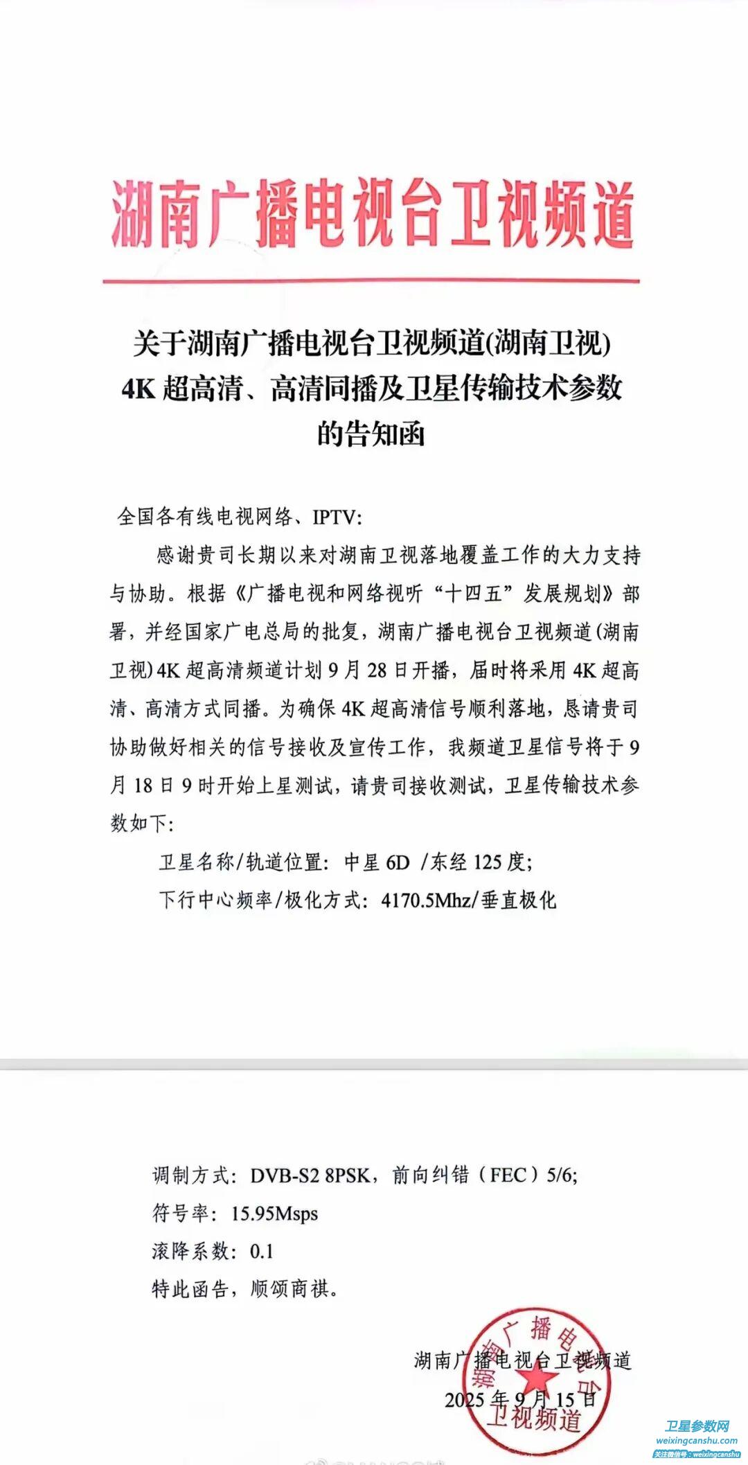 关于湖南广播电视台卫视频道(湖南卫视)4K超高清、高清同播及卫星传输技术参数的告知函全国各有线电视网络、IPTV: