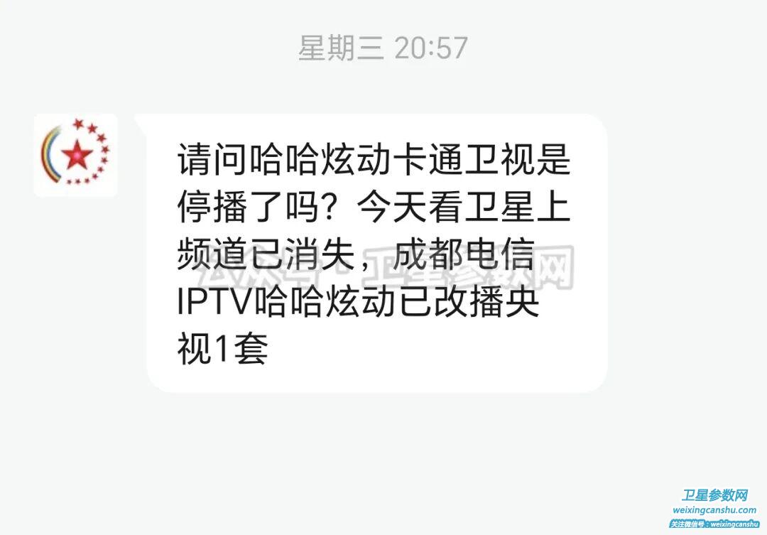 有网友后台留言:请问哈哈炫动卡通卫视是停播了吗?今天看卫星上频道已消失,成都电信IPTV哈哈炫动已改播央视1套。