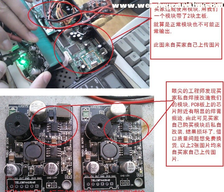 公布无良奸商,要做寻星仪的朋友注意了!起因是前几天想做寻星仪,就淘宝买了两种DC板共四块!都是在同一奸商那里买的,不知道还有多少星友买过不敢吭声!奸商是湖南张家界永定的,在淘宝有五六个马甲,产品牛嗨吹得天花地乱,什么保修来回运费7天无条件什么的等等!算是垄断生意吧!我想买过他产品的星友都知道,核心芯片编号都被打磨掉了的!要是出了问题想保修或者换货,你就甭想了,因为奸商一开始就在DC板上做了手脚,看看以下奸商给我盖的帽,厉害吧!还有,那款黑的产品20V的升压电压只有15.3V,跟垂直电压一样!只要你想找他理论或者换货,他就会说这是鬼子的标准给鬼子用的,我们不是鬼子不合适或者说我们的板子是山寨货不配套!唉,不想多说了,一想起就气愤,不过给大伙做做小白也好!要是大伙想体验,那就不听劝告自己买去吧!!!亮点星友们找找!!!