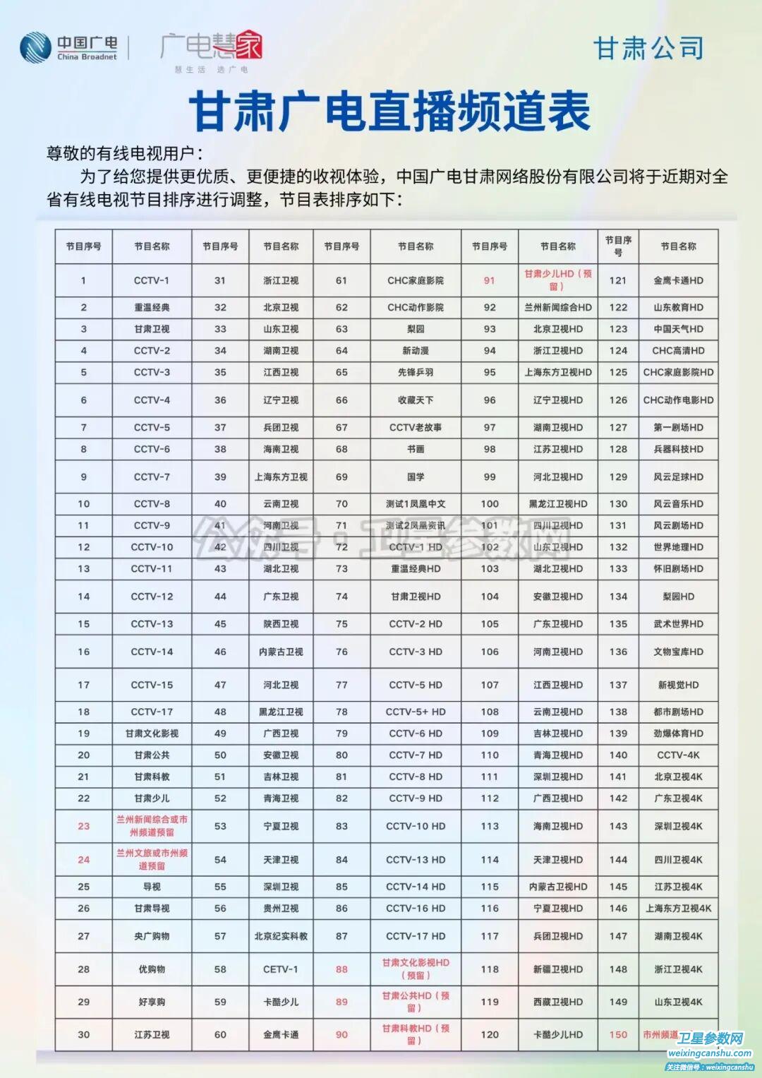 最近中国广电甘肃网络股份有限公司发布的直播频道表。