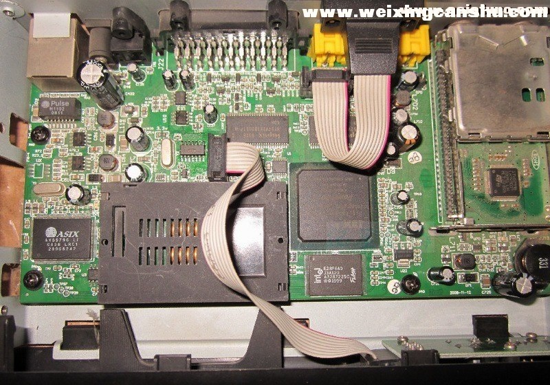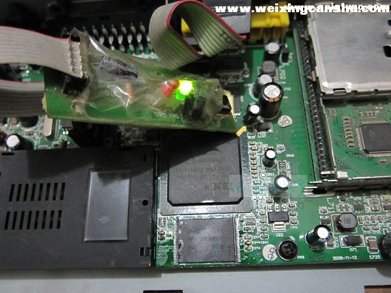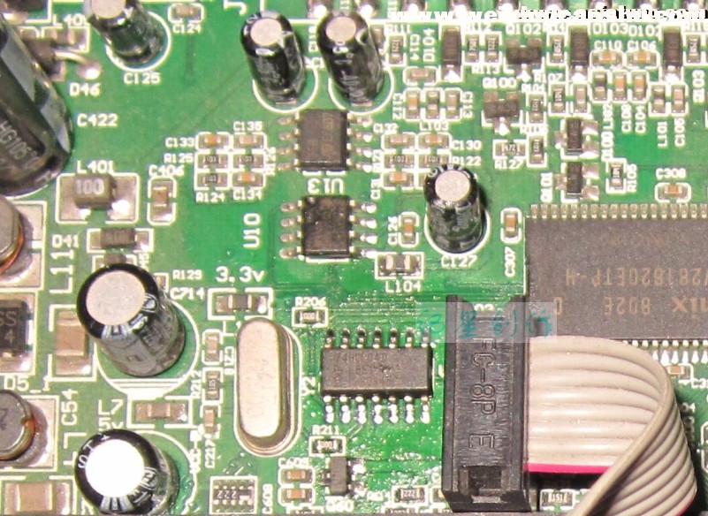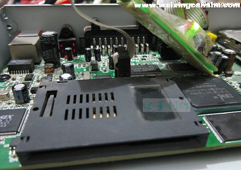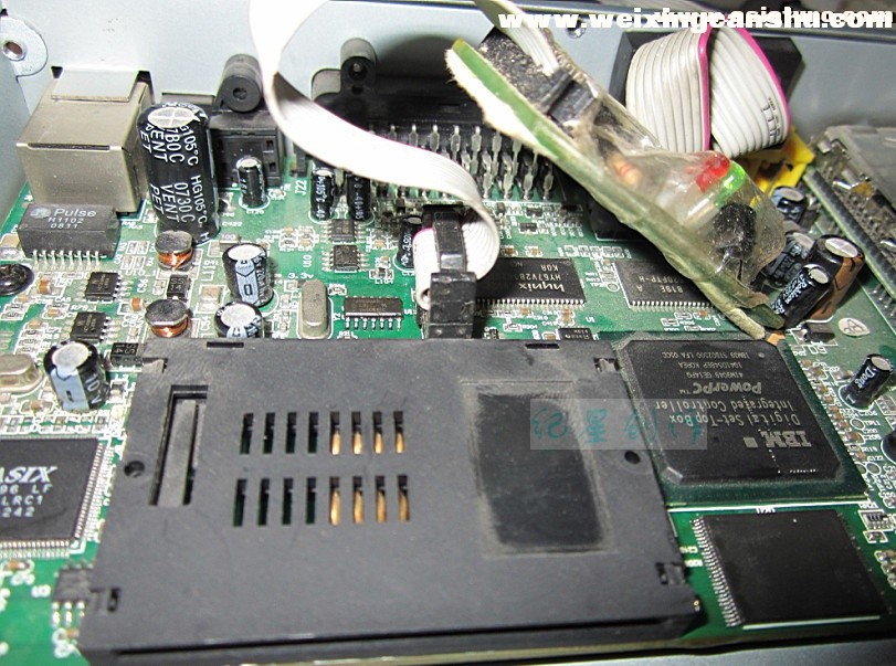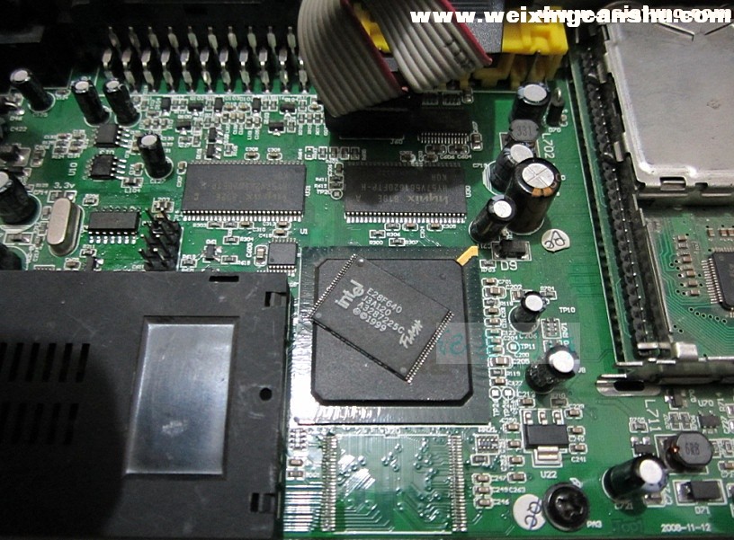 剩下③了。唯有换闪存了,因为该主板没有JTAG接口。换闪存不是难事,木有技术含量。一番吹焊后,写好程序的闪存换好。通电,面板灯亮起,数秒后,机器正常启动,画面出现,接上天线,节目下载,机器修复!