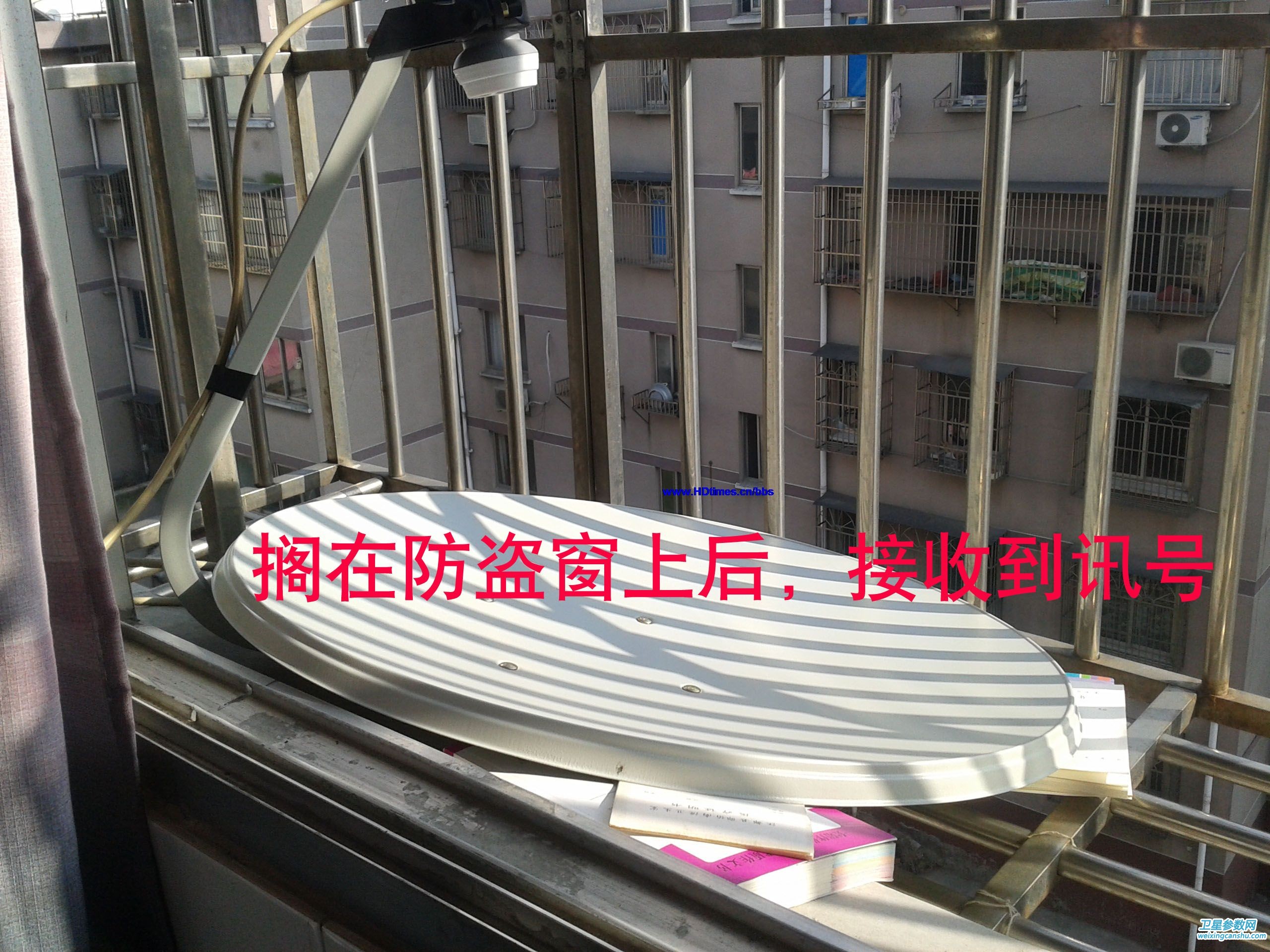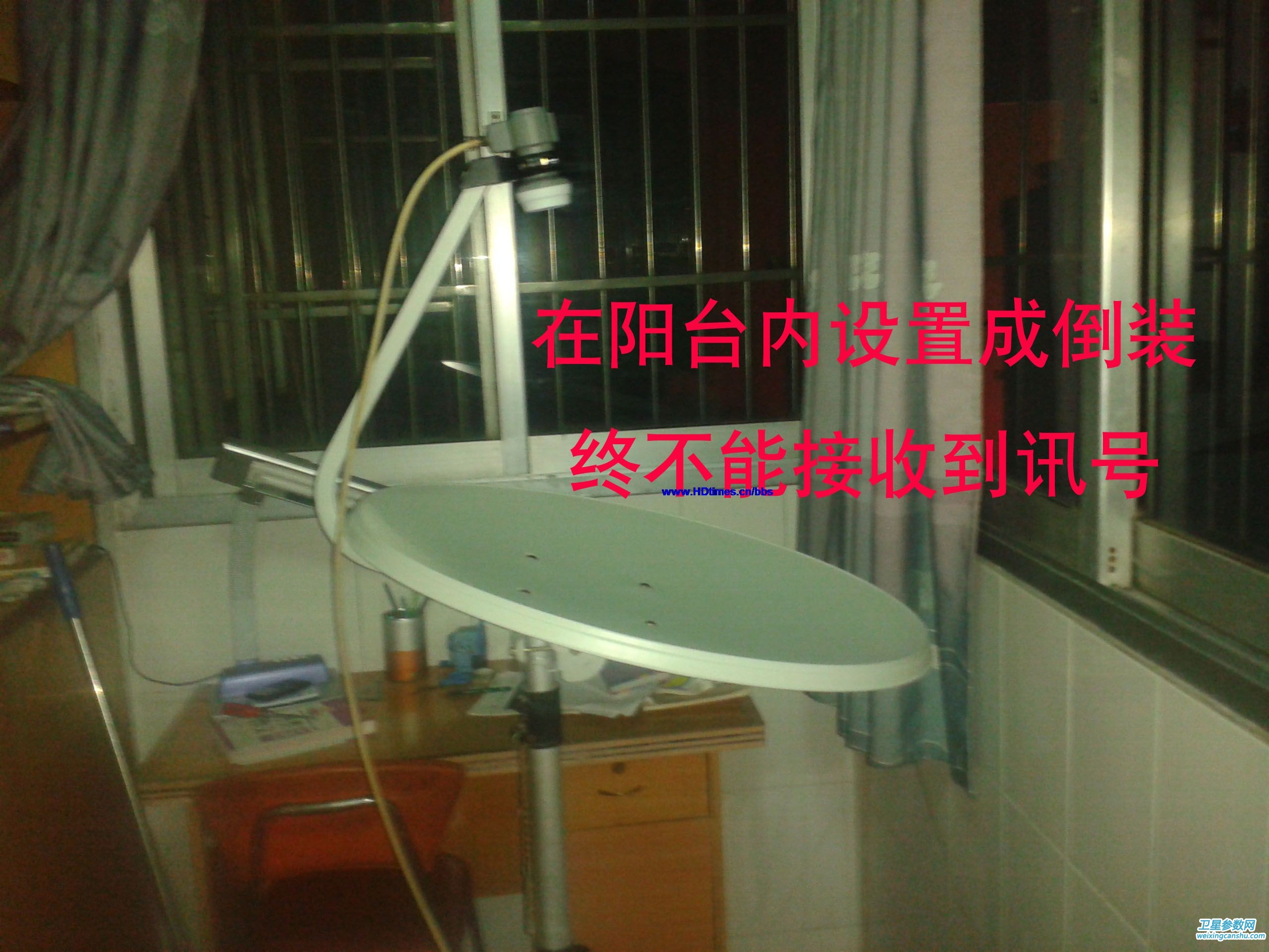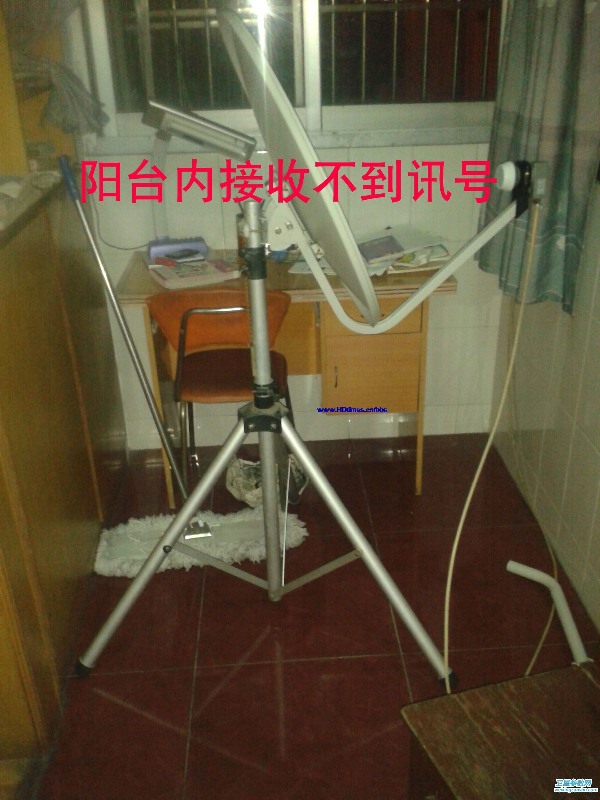 2011年11月21日晚回家打开机器后发现无讯号,爬上公用阳台后发现天线不翼而飞。后来知道因为平台防水改造被工人拆了当破烂卖掉!!!,本来想去讨回来,哪里知道那鸟人说卖了喝酒了,气疯老朽。。。。。回家后拿出备用天线及音响支架被准备阳台内接收,后来(附图)。。。。。。