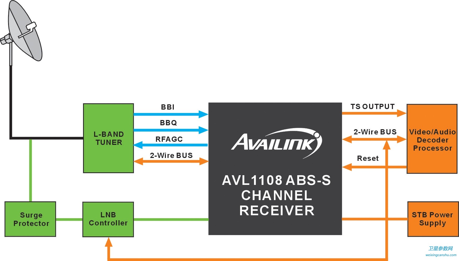 ● AVL1108主要功能包括基带信号解调和信道解码,用于将卫星调谐器输出的ABS-S基带信号转换成TS流,并通过简单的接口提供给后端解码芯片。