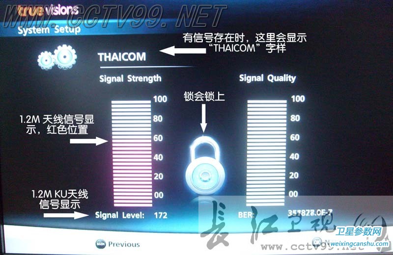 进入天线设置项目:1.2米KU天线信号信号限时:172, 天线信号限时红色位置,当天线对准卫星有信号的时候最上部第一行会出现:THAICOM 字样,同时一个传统挂锁的图标会锁上。【如下图所示】