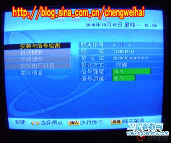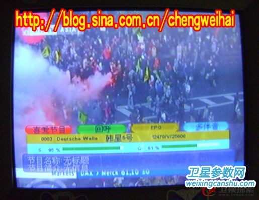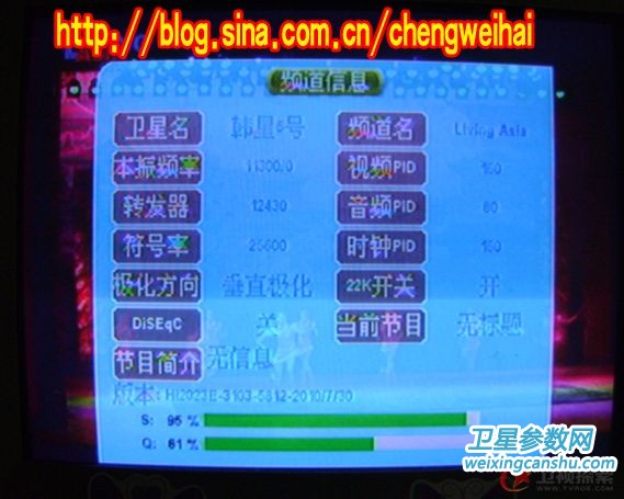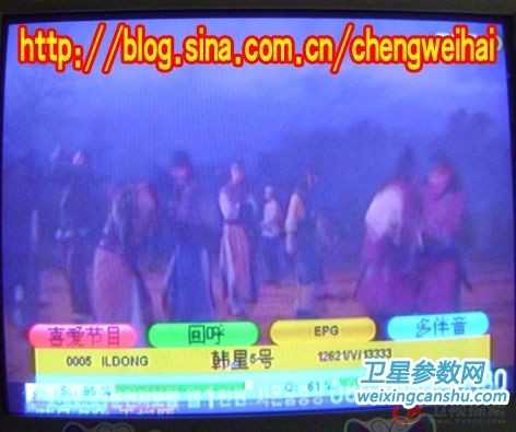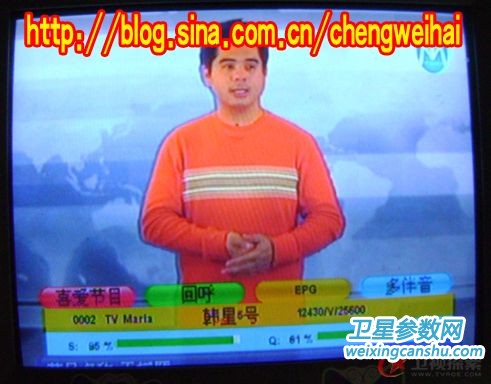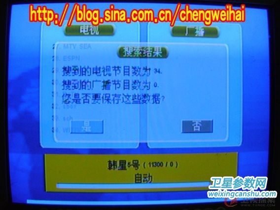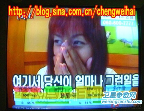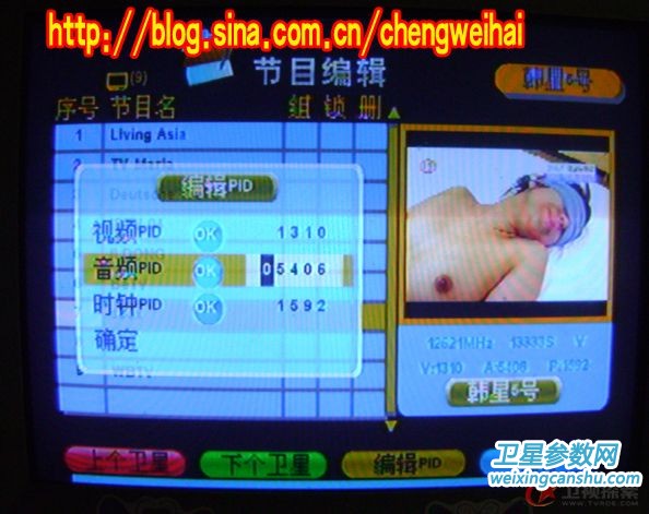 回到房里接上馈线、信号线、电源线,开机和电视!机顶盒内有预存韩五的转发器参数,直接搜索,得到34套节目,除去加密的还有9套(其中美发频道和WB-TV黑屏),然后再将S BOX PID改为1310 5406 [S]CH PID改为 8018 3922 ,最后得到的是七套节目!两套**cr节目!现发几张照片给大家欣赏!!!