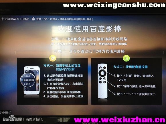 方法二:准备影棒配套的遥控器,影棒断电重启,当看到“百度影棒”这四个字时不要理会,待屏幕闪烁变黑了迅速按遥控器上的菜单键。当你看到左下角出现安全模式四个字,恭喜!成功进入安全模式!注意:遥控器要对着接收端确保接收良好。