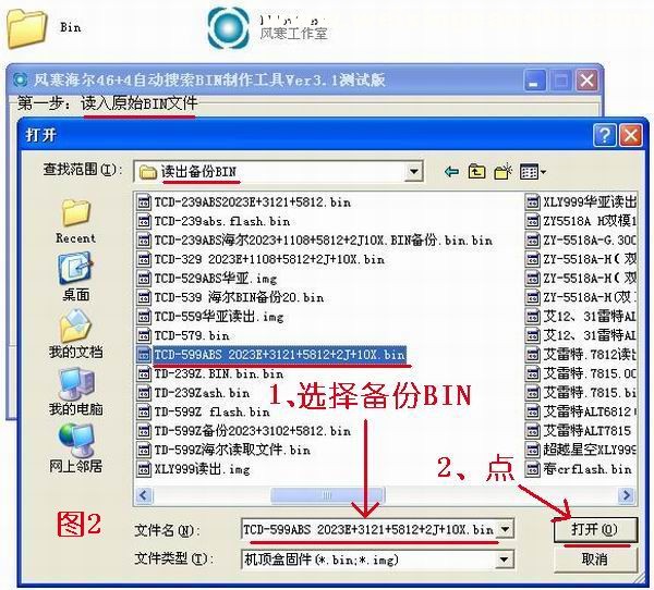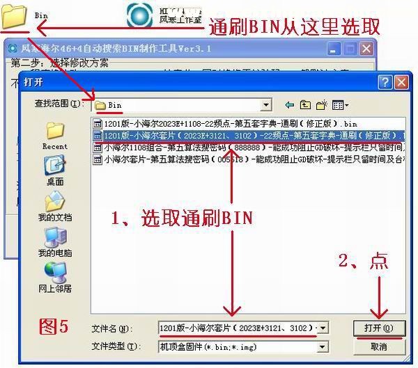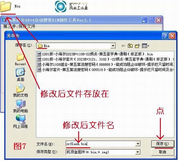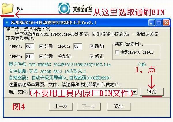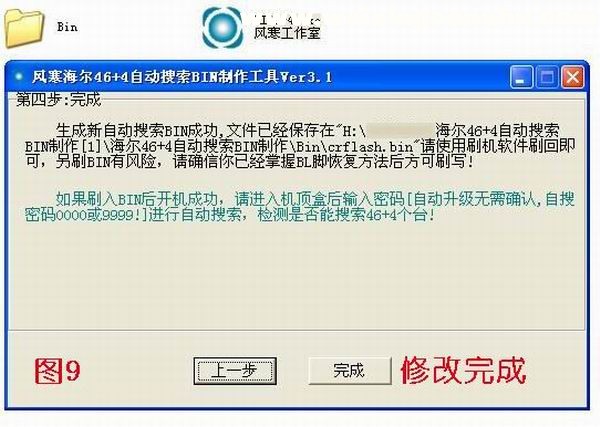 风寒海尔46+4自动搜索BIN制作工具Ver3.1测试版,通过修改部分字节,把通刷BIN修改成我们需要的刷机BIN。工具没有更新,这几天试验还是好用,可解决屏显不正常、遥控器不能用等问题。现把工具发上来供测试,工具中的BIN文件夹有四个最新12、01通刷BIN文件可选用,其中两个6位密码的,修改后要输入6位密码才能46+9台。只要有原机能正常使用(不管收几台)备份BIN,按下面图示修改即可成功。